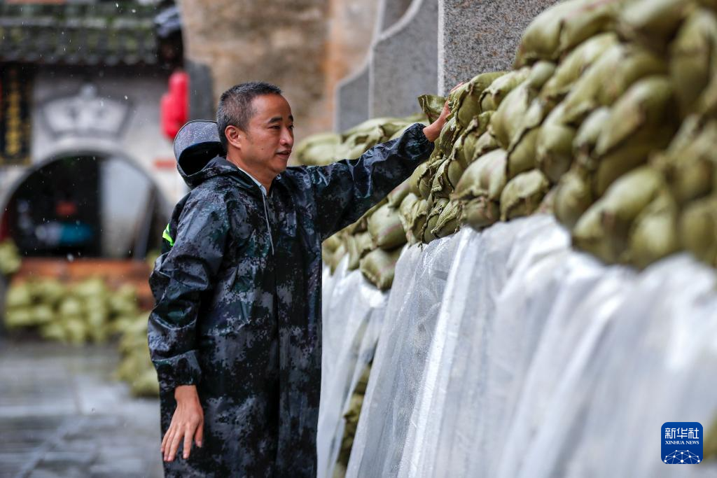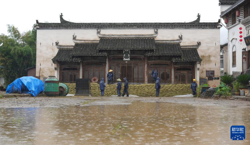 6月27日,在黄山市徽州区呈坎村,工作人员加固文物保护单位长春社前的防汛沙袋。