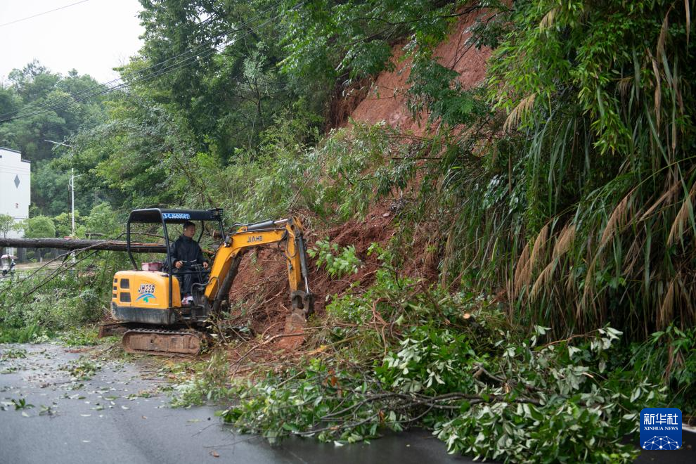 6月25日,在黄山市屯溪区百鸟亭小学尤溪校区门口,挖掘机驾驶员汪惠平操作挖掘机清理塌方路段。