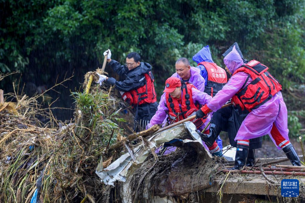 6月26日,山越救援队队员在黄山市歙县绍濂乡和平村清理老桥上的树干和树枝。