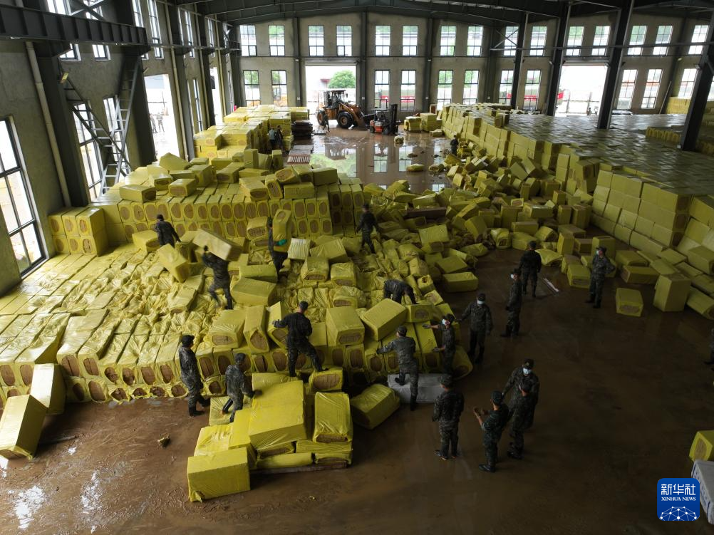 6月25日,在黄山市歙县经济开发区黄山百斯特岩棉科技有限公司,武警安徽总队黄山支队官兵在抢运物资(无人机照片)。