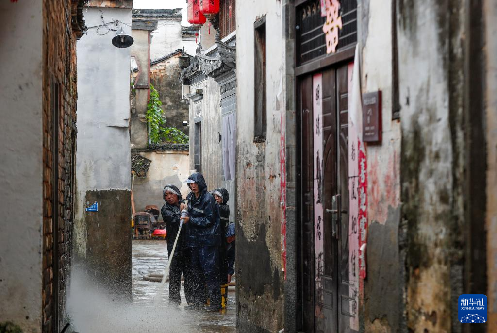 6月27日,在黄山市徽州区呈坎村,工作人员清理过水后的石板路面。