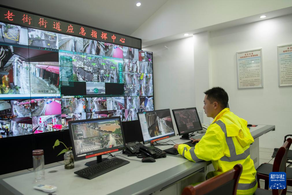 6月26日,在黄山市屯溪区老街街道应急指挥中心,老街专职消防队队长程顺富查看全国重点文物保护单位屯溪老街内积水情况。