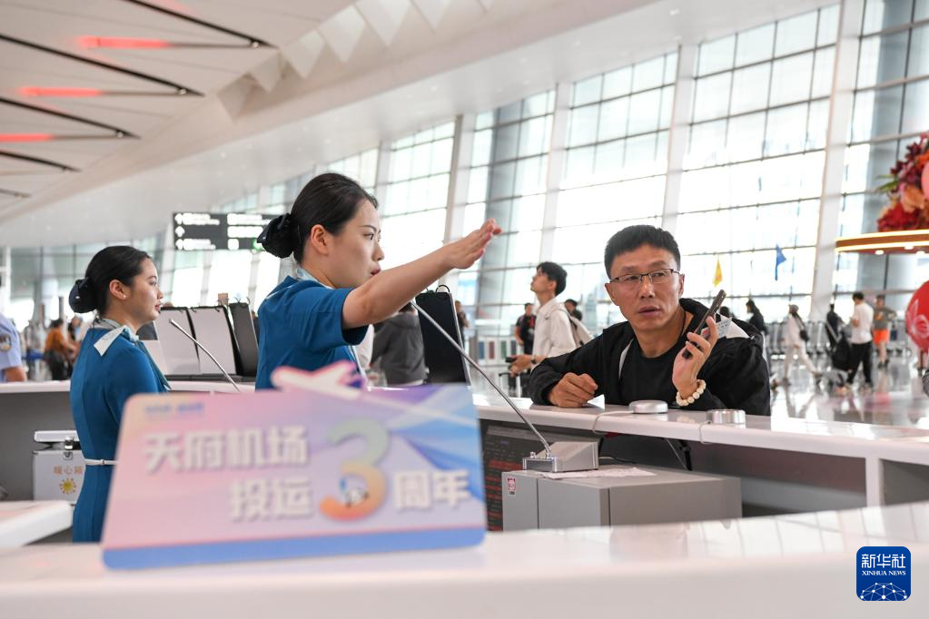 6月27日,在成都天府国际机场T2航站楼内,工作人员为旅客提供指引服务。