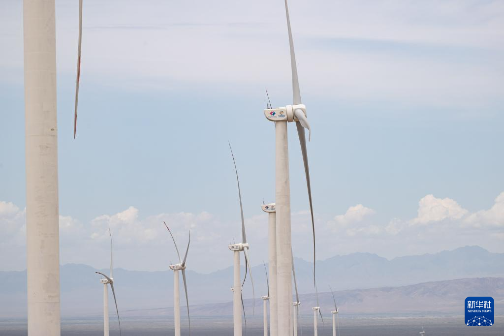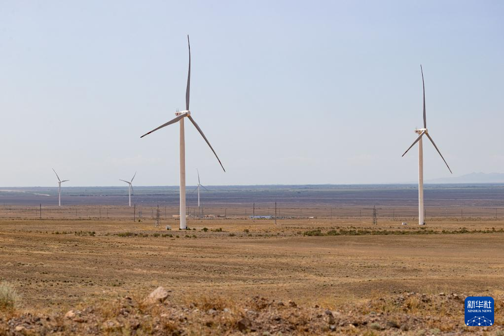 6月25日,在哈萨克斯坦阿拉木图州谢列克风电场,工作人员巡视风机设备。