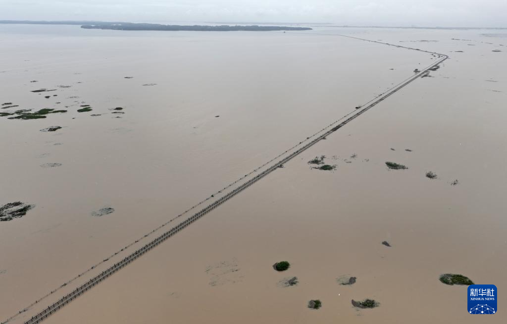 鄱阳湖水位上涨,有“最美水上公路”之称的永吴公路大湖池段已被淹没(6月26日摄)。