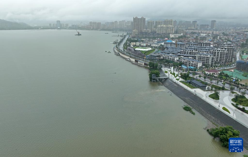 在江西省庐山市,亲水步道已被上涨的湖水淹没(6月27日摄,无人机照片)。