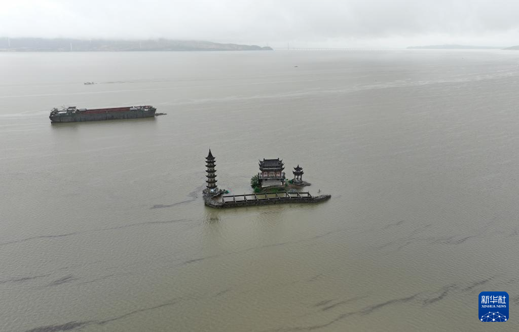 鄱阳湖水位上涨,湖区的落星墩底部已被淹没(6月27日摄,无人机照片)。