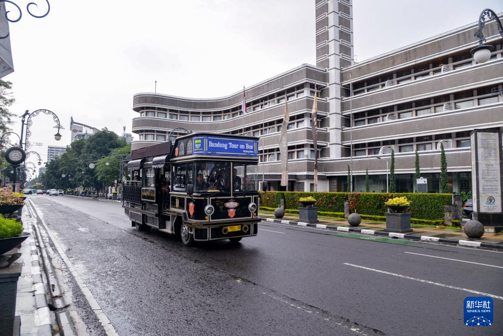 在印度尼西亚万隆,一辆万隆旅游公交行驶在亚非大道上(3月7日摄)。