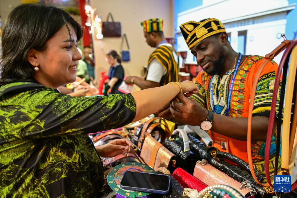 6月27日,在第八届中国-亚欧博览会上,加纳共和国参展商为参观者试戴手链。