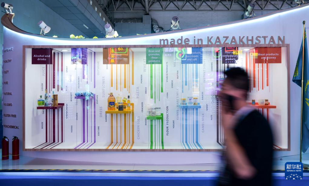 6月27日,在第八届中国—亚欧博览会上,观众经过哈萨克斯坦展台橱窗。
