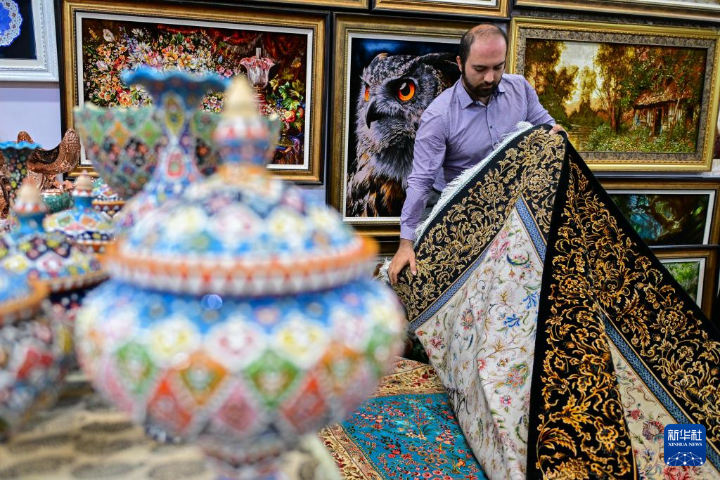 6月27日,在第八届中国-亚欧博览会上,伊朗展台工作人员整理展出的地毯。