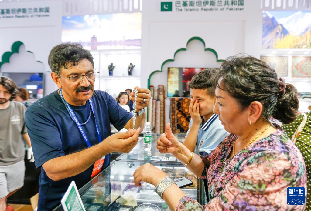 6月27日,在第八届中国—亚欧博览会上,参观者在巴基斯坦展台选购首饰。