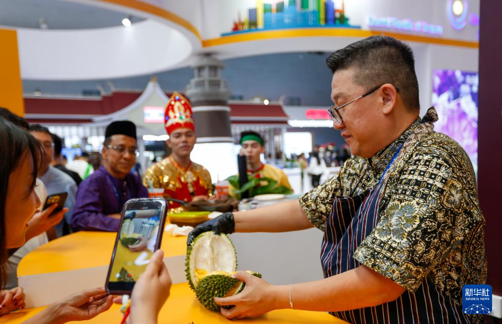 6月27日,在第八届中国—亚欧博览会上,马来西亚展台工作人员打开榴莲供参观者品尝。