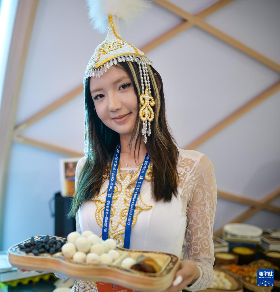 6月26日,在第八届中国—亚欧博览会上,哈萨克斯坦展台工作人员展示特色食品。
