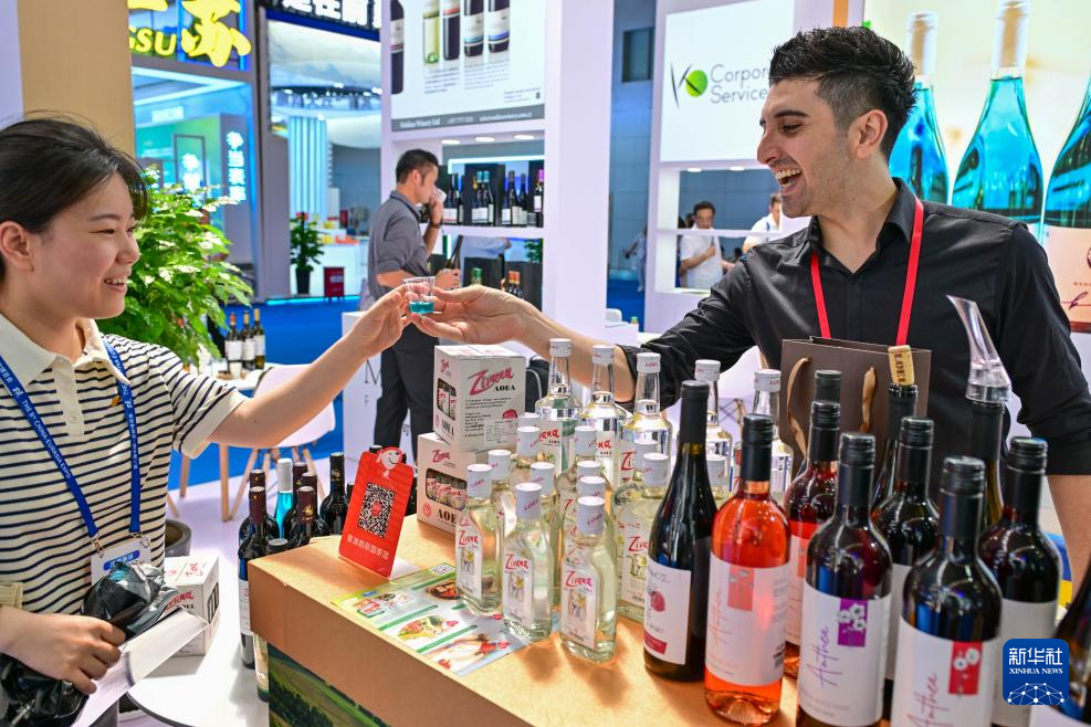 6月27日,在第八届中国-亚欧博览会上,塞浦路斯展台工作人员邀请参观者品酒。