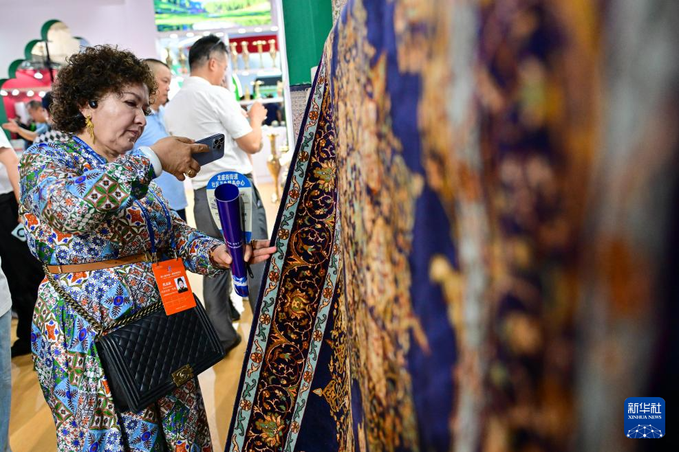 6月27日,参观者在第八届中国—亚欧博览会巴基斯坦展台拍摄地毯。