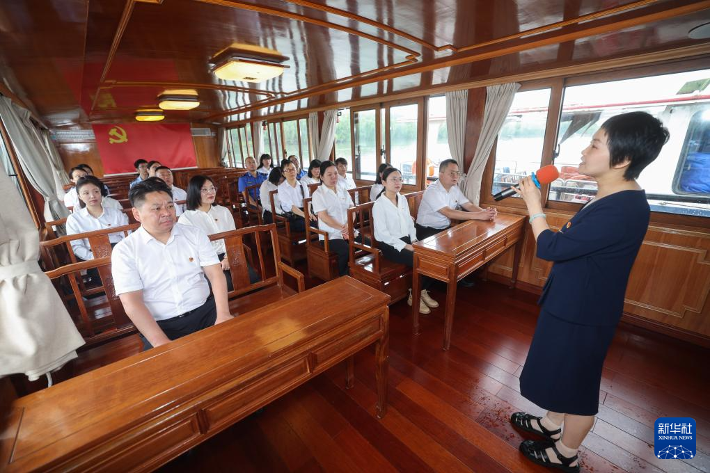 6月28日,来自嘉兴市南湖区南湖街道机关党委的党员们在“南湖水上课堂”重温建党历史,感悟红船精神。