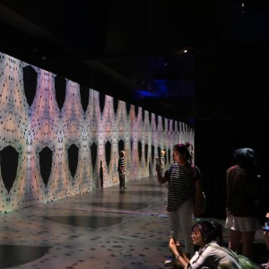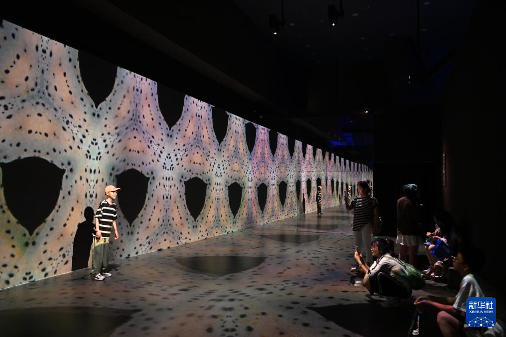6月28日,小朋友在国家海洋博物馆的遇见蓝眼泪特色展厅内留影。