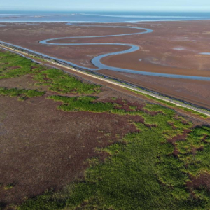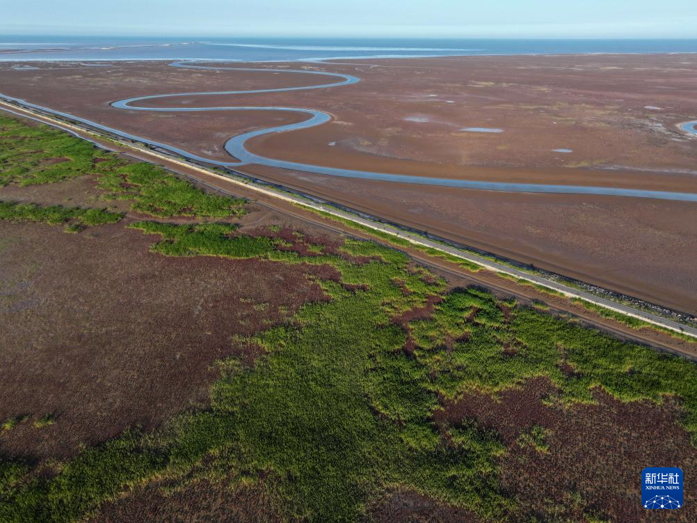 这是6月25日在山东东营黄河三角洲国家级自然保护区湿地拍摄的互花米草被清理过后的河滩。