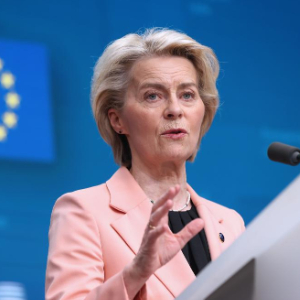 这是3月21日在比利时布鲁塞尔拍摄的欧盟委员会主席冯德莱恩出席新闻发布会。