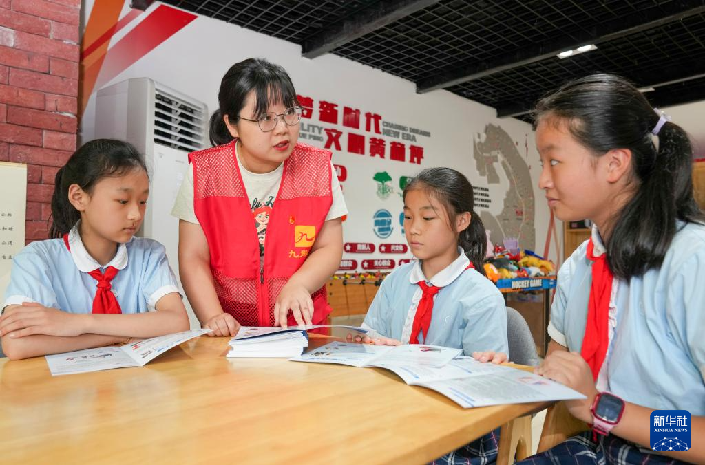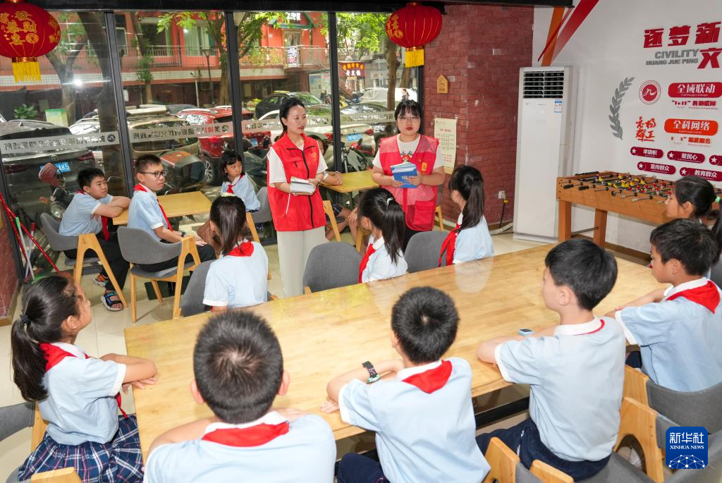 6月29日,在九龙坡区黄桷坪街道邮电支路社区活动室内,来自重庆铁路小学的志愿者周雪(左二)结合暑假期间容易忽视的安全问题对孩子们进行重点提醒。