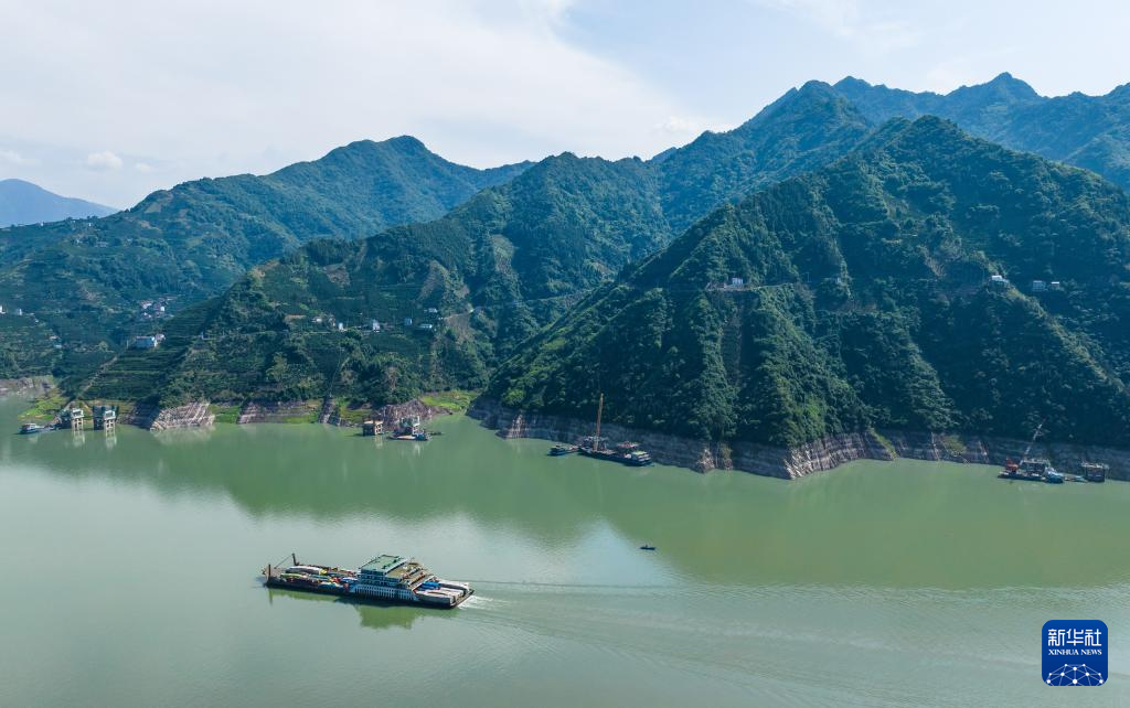 6月29日,船舶从三峡通航船舶秭归旧州河锚地施工工地前开过(无人机照片)。
