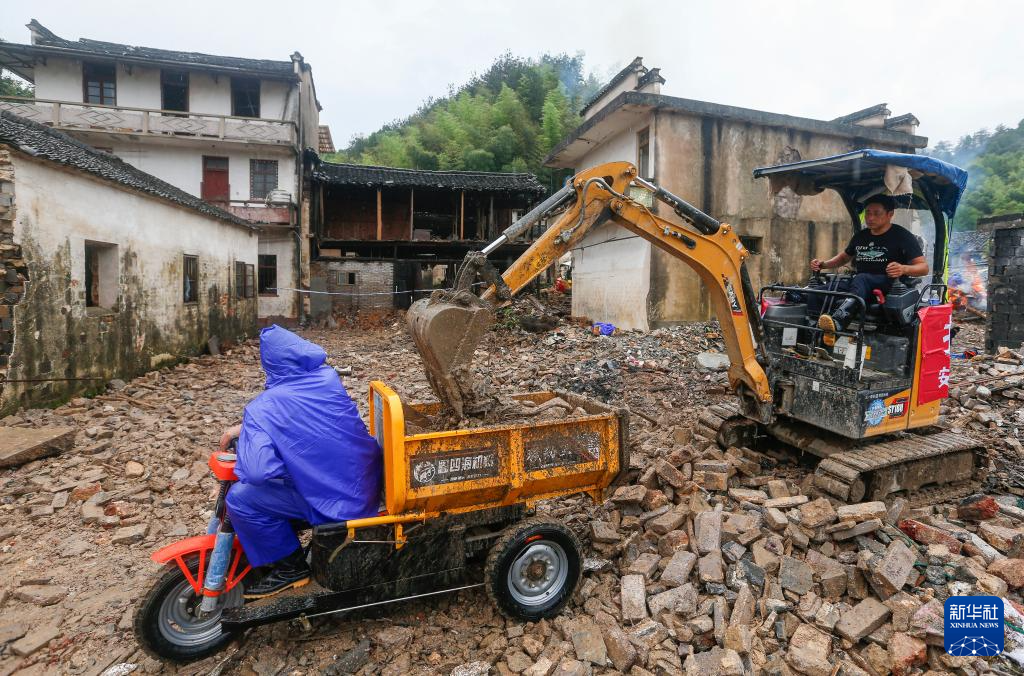 6月28日,工作人员在黄山市歙县溪头镇进行灾后清理工作。
