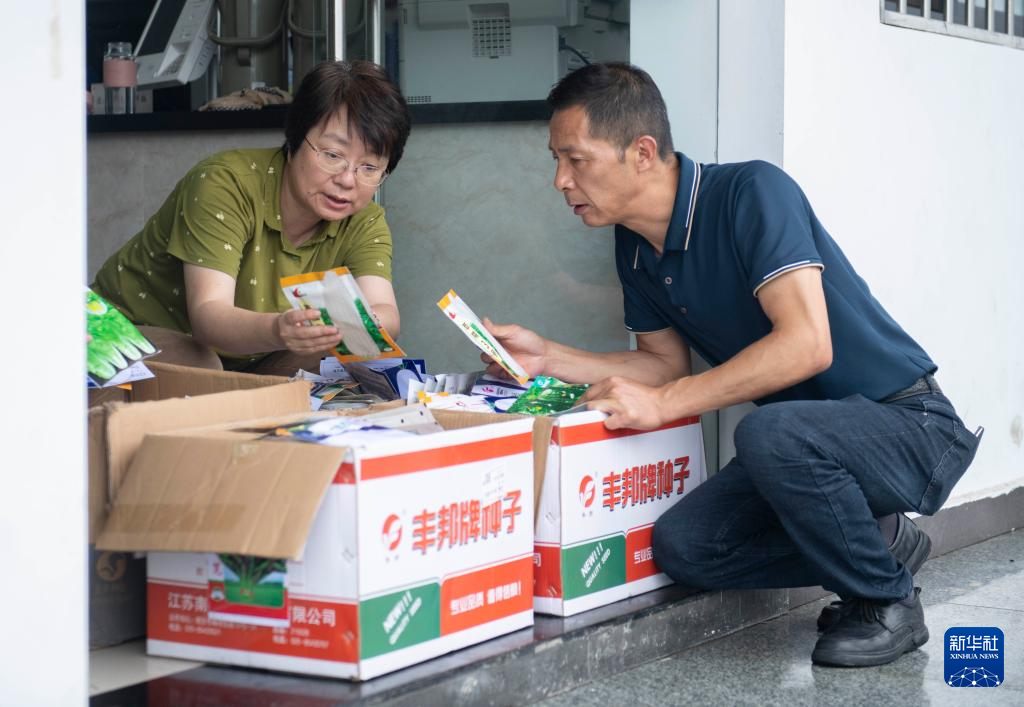 6月28日,在黄山市屯溪区奕棋镇徐村,屯溪区农业农村局工作人员方晓静(左)为徐村党支部书记钟朝晖介绍区农业农村局向徐村发放的种子。