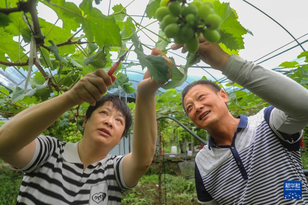 6月28日,在黄山市黄山区耿城镇,农技人员余中萍(左)指导果园园主胡传海对果园开展科学管护。