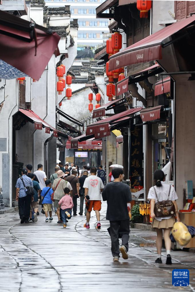 6月28日,在黄山市屯溪区,游客在中国历史文化名街屯溪老街游览。