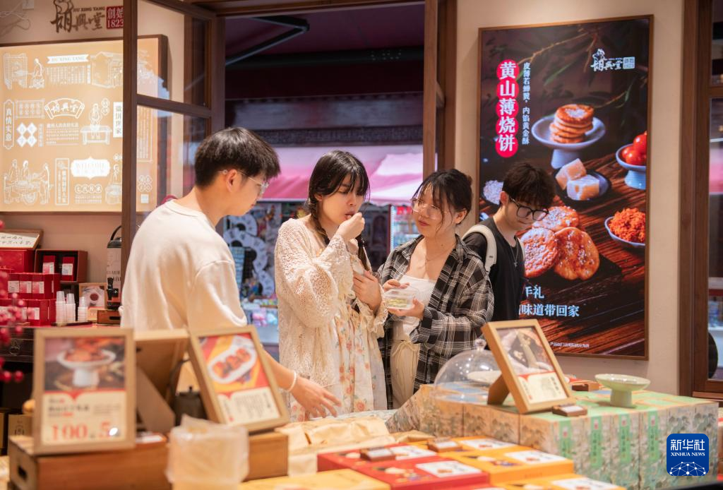 6月28日,在位于黄山市屯溪区的中国历史文化名街屯溪老街,游客在一家店铺试吃黄山特色小吃。