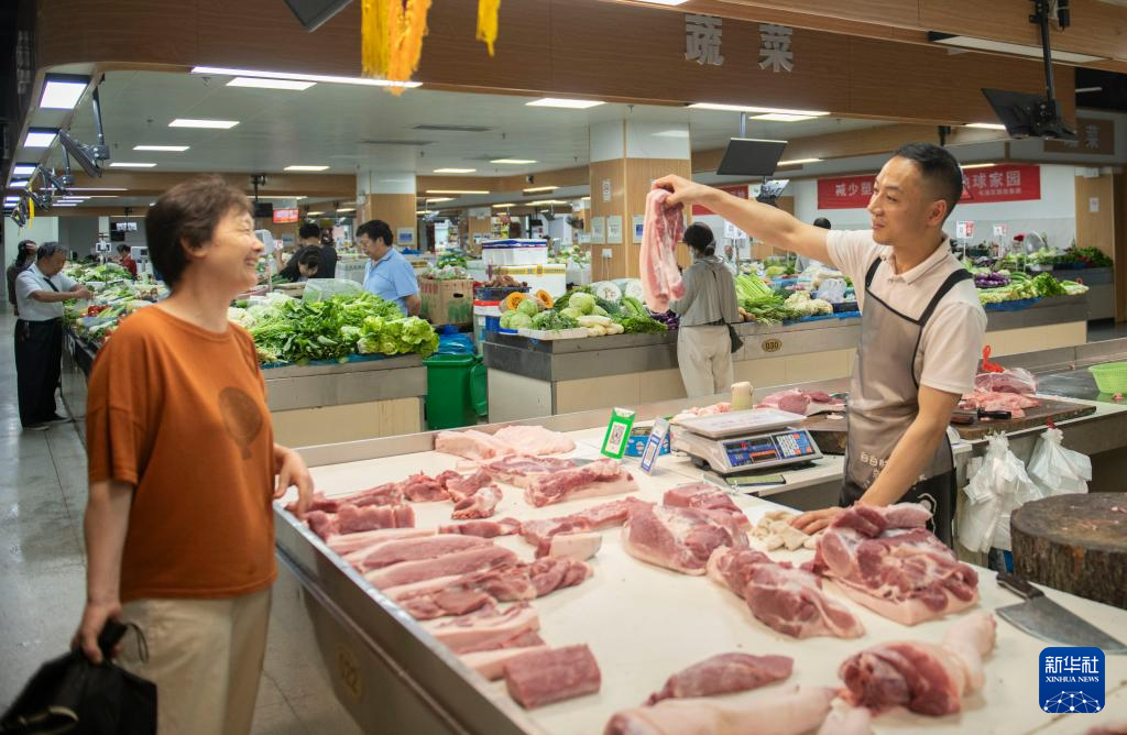 6月28日,在黄山市屯溪区阜上邻里中心菜市场,商户向顾客展示猪肉。