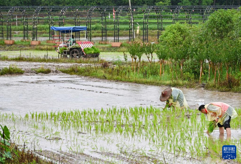 6月28日,在黄山市屯溪区奕棋镇朱村,“春晓”志愿服务队队员和村民一起补种水稻秧苗。