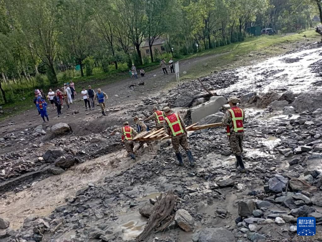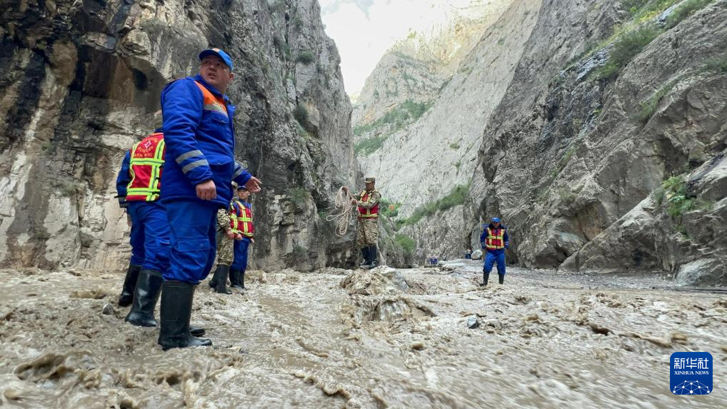 6月28日,在吉尔吉斯斯坦奥什州努卡特地区,救援人员在抢险救灾。