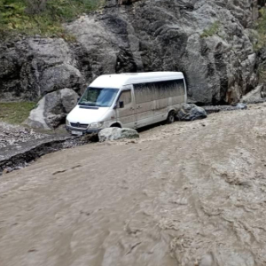 6月28日,在吉尔吉斯斯坦奥什州努卡特地区,一辆中巴车停在被泥石流冲毁的道路旁。