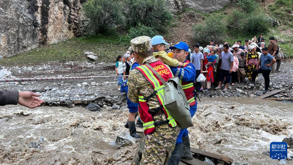 6月28日,在吉尔吉斯斯坦奥什州努卡特地区,救援人员转移受灾群众。