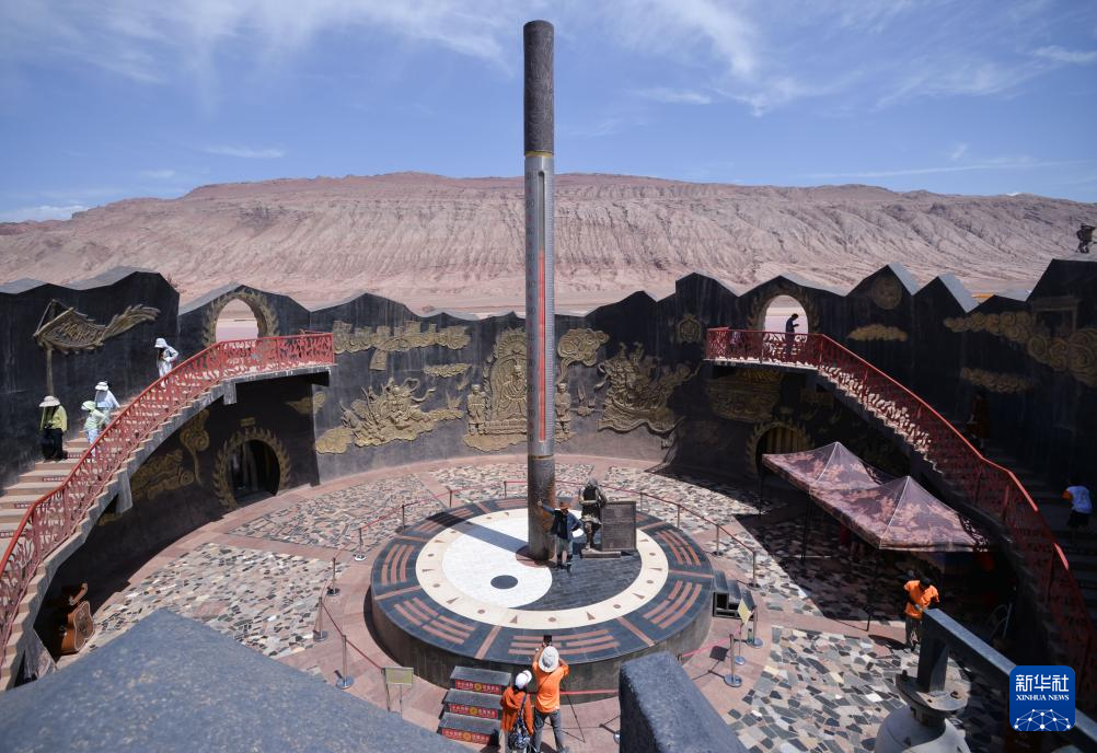 6月29日,游客在吐鲁番火焰山景区的巨型温度计下留念,该巨型温度计显示地表温度超过70摄氏度。