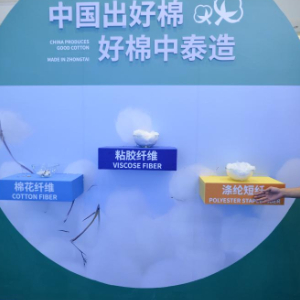 6月30日,在第八届中国—亚欧博览会上,新疆中泰(集团)有限责任公司工作人员展示纺织材料产品。