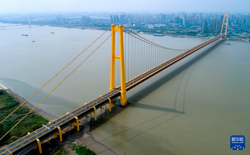 这是2019年10月8日拍摄的武汉杨泗港长江大桥(无人机拍摄)。2019年,武汉杨泗港长江大桥通车,该桥全长4.13公里,主跨1700米。