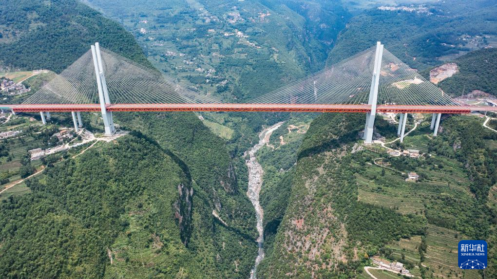 这是2023年8月15日拍摄的贵州、云南交界处的杭瑞高速北盘江大桥(无人机照片)。于2016年12月通车的北盘江大桥连接起了被峡谷隔绝的滇黔两地,垂直高度达565米。