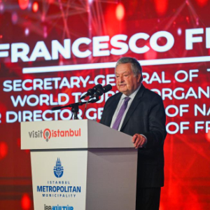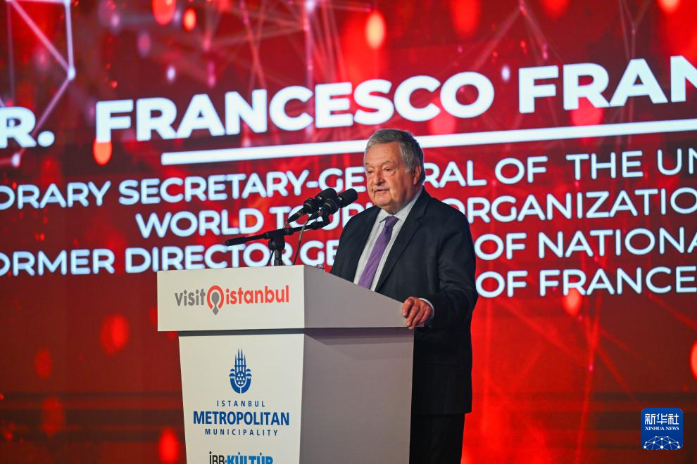 6月28日,在土耳其伊斯坦布尔,联合国世界旅游组织荣誉秘书长弗朗西斯科·弗兰贾利在活动现场致辞。
