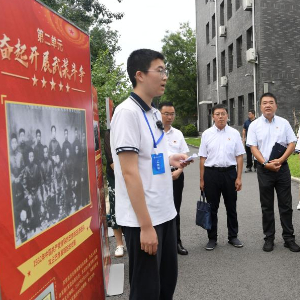 7月1日,在北京市丰台区第二中学,学生志愿者为观看展览的嘉宾和同学讲解。