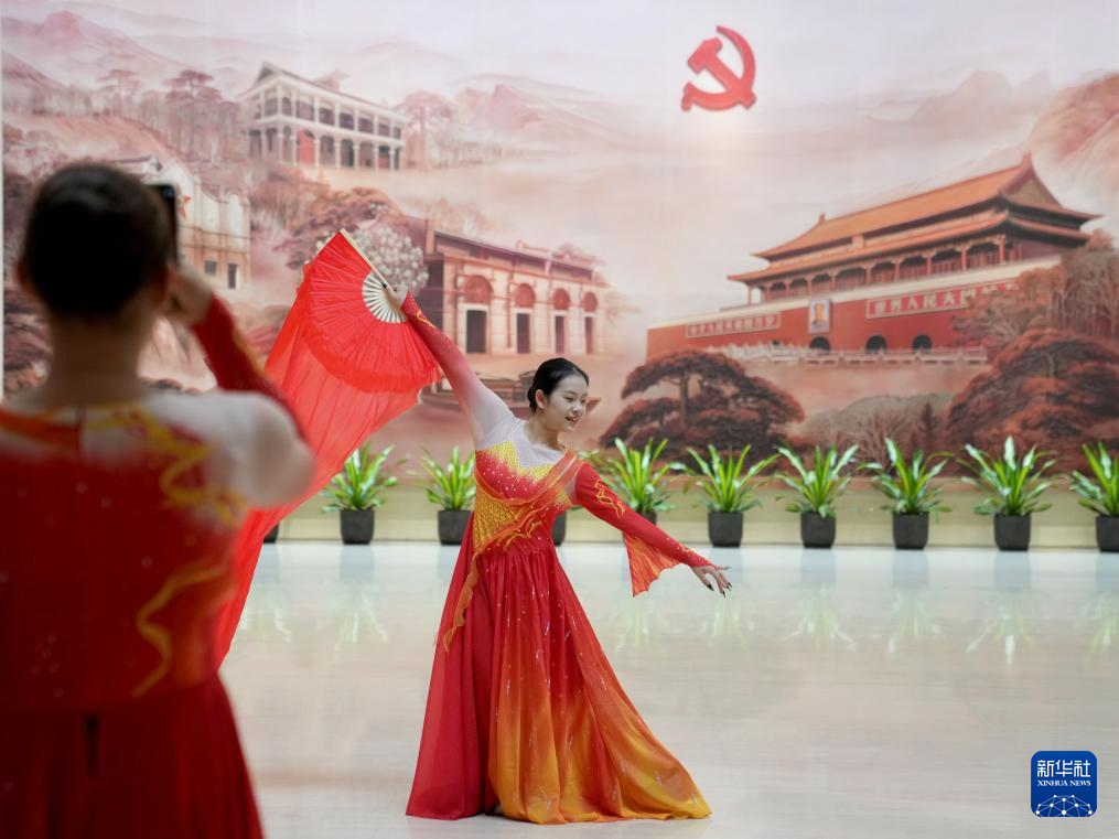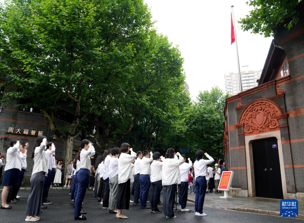 当日,人们来到上海中共一大纪念馆,参加升国旗、新党员入党宣誓、红色文化演出等活动,庆祝中国共产党成立103周年。