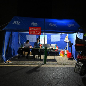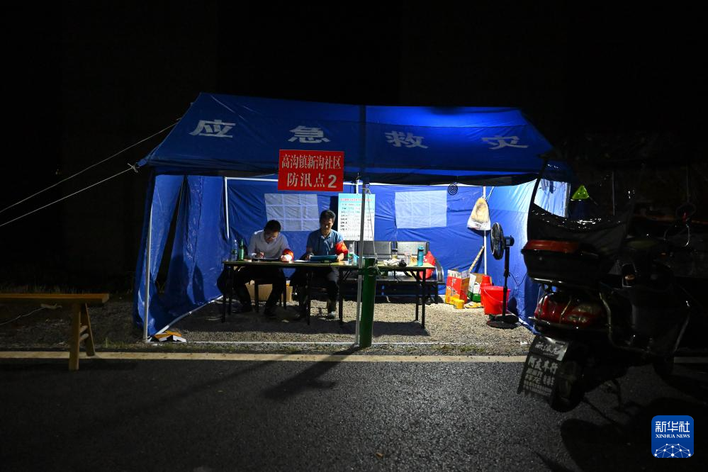 7月1日晚,工作人员在安徽省芜湖市无为市高沟镇新沟社区的防汛工棚内值守。