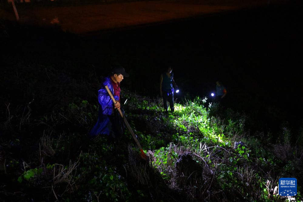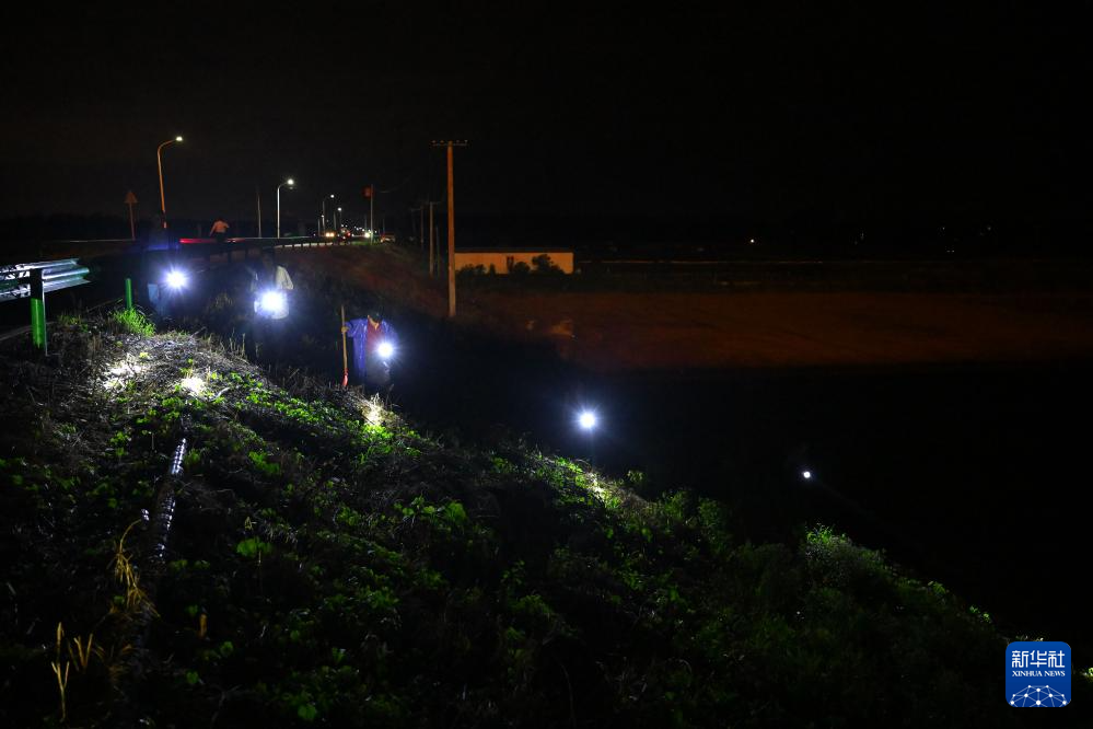 7月1日晚,巡护人员在安徽省芜湖市无为市高沟镇新沟社区的长江堤防上巡堤查险。
