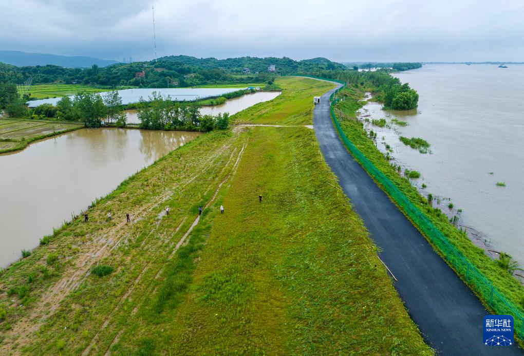 7月1日,巡护人员在安徽省芜湖市繁昌区新港镇的长江堤防上巡堤查险(无人机照片)。