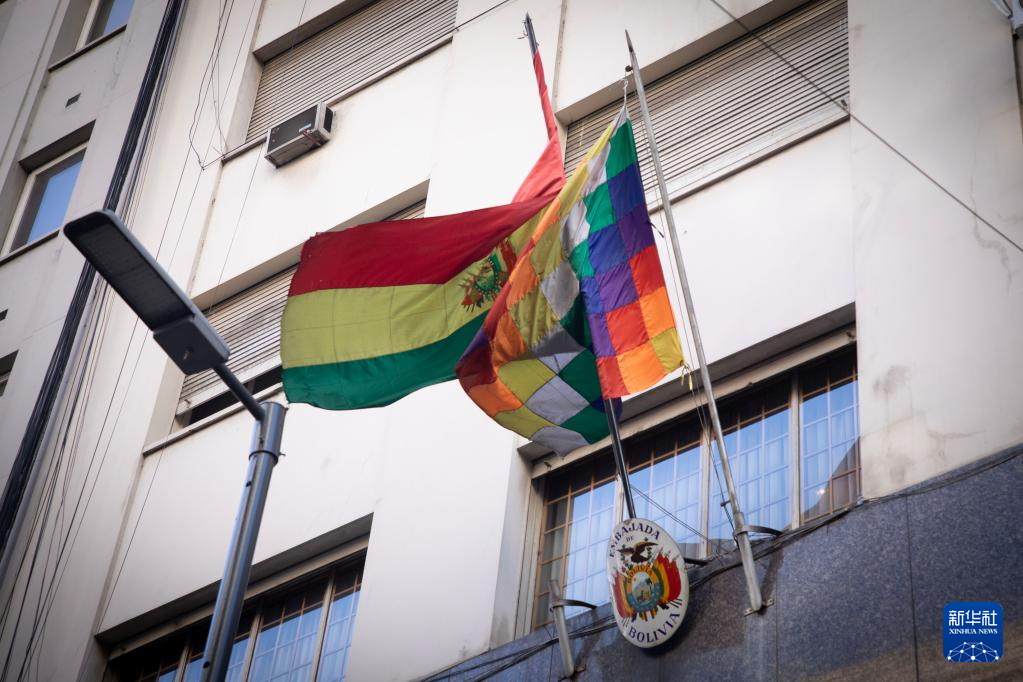 这是7月1日拍摄的位于阿根廷首都布宜诺斯艾利斯的玻利维亚驻阿根廷大使馆建筑上的玻利维亚国旗(左)和国徽。