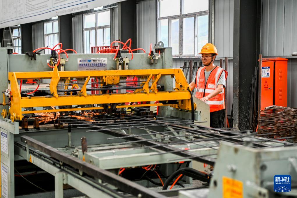 7月2日,在位于广西百色市凌云县的一处黄百铁路钢筋加工场,工人操作全自动机械焊接钢筋网片。