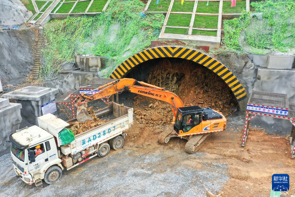 7月2日,在位于广西百色市凌云县的黄百铁路平拉隧道建设现场,工人操作挖掘机清理碎石(无人机照片)。