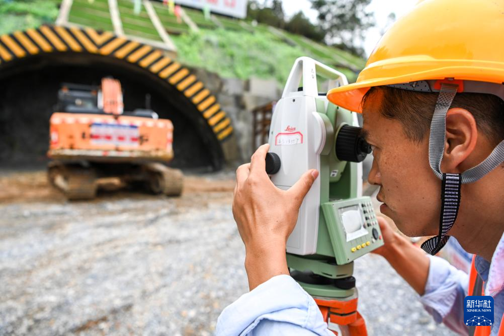 7月2日,在位于广西百色市凌云县的黄百铁路平拉隧道建设现场,工人进行测量作业。